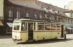 “Den ældre kvindelige sporvognskonduktør Hildegard Mielke ser vi i hendes vogn foran banegården. Hun har kørt i Potsdam siden 1985 og er nu parat til at blive pensioneret. Hendes første sporvogn var den lysegule fra Gothafabrikken i DDR, – nej først var hun billettør ved bagindgangen, inden hun blev forfremmet. Hun husker, at der på ruderne var indgraveret mottoet Für Frieden und Sozialismus, og faktisk var det også nogle fredelige ture, hun kørte, hvor der var orden ombord og fredelige omgivelser, når hun styrede ud igennem skovområderne til de forskellige endestationer. Socialismen kunne hun også godt være enig i, for billetprisen på 20 pfennig var overkommelig for alle. Dog var det lidt irriterende, når hun måtte stoppe for de lange sorte Volvoer, der ovenikøbet tillod sig at benytte hendes spor, når de havde travlt. Efter genforeningen blev hendes sporvogne grønne og kunne køre væsentligt hurtigere. Stoppestederne blev nu annonceret på engelsk, men det forstod hun ikke meget af, da hun kun havde lært russisk i skolen.”